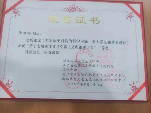 我校徐治彬老师获“第十七届浙江省马克思主义理论研讨会”二等奖